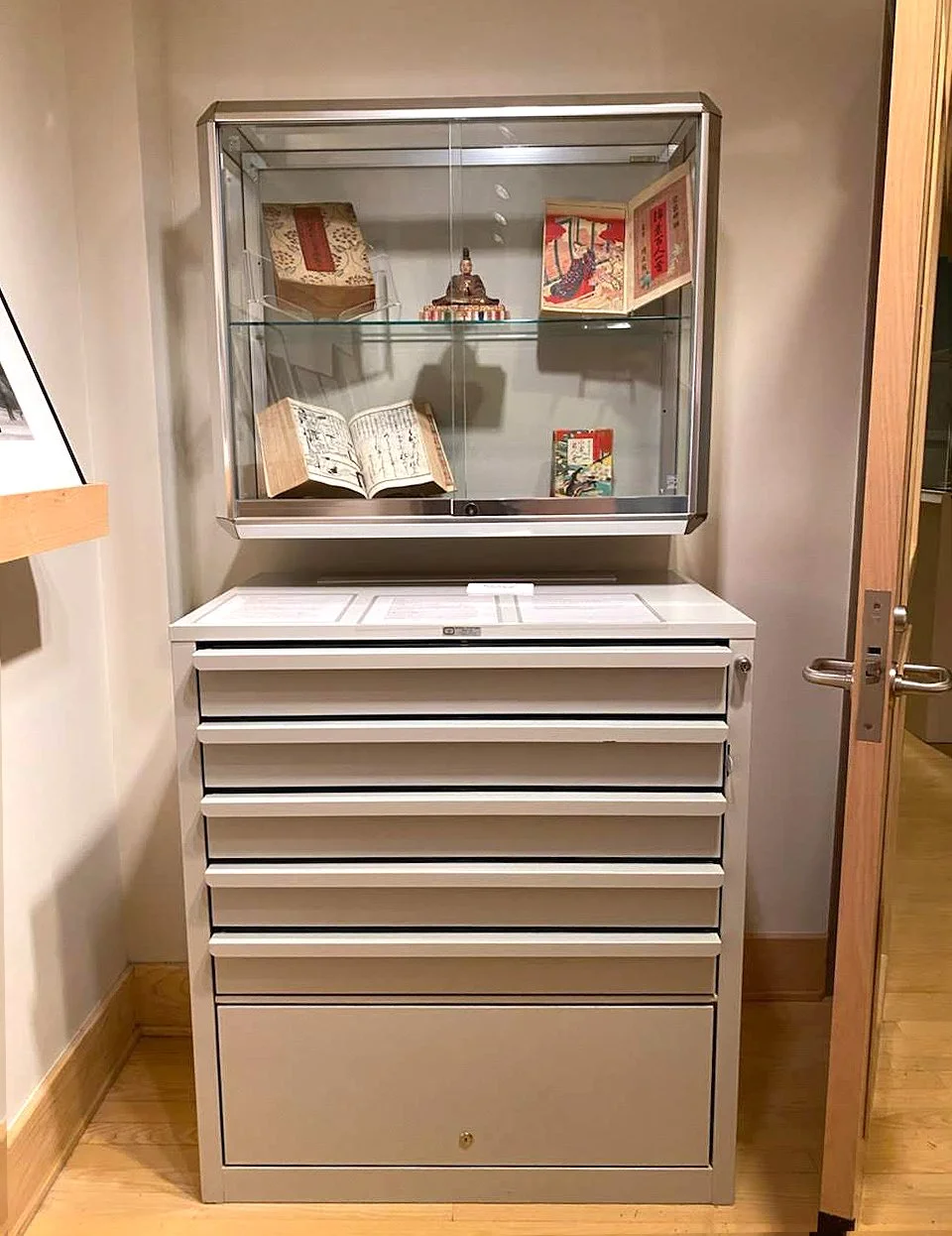 The exhibition is contained in two cabinets, as shown below left, in a total of ten drawers. Before this project the drawers were in disarray and lined with grey fabric display elements, as shown below right.