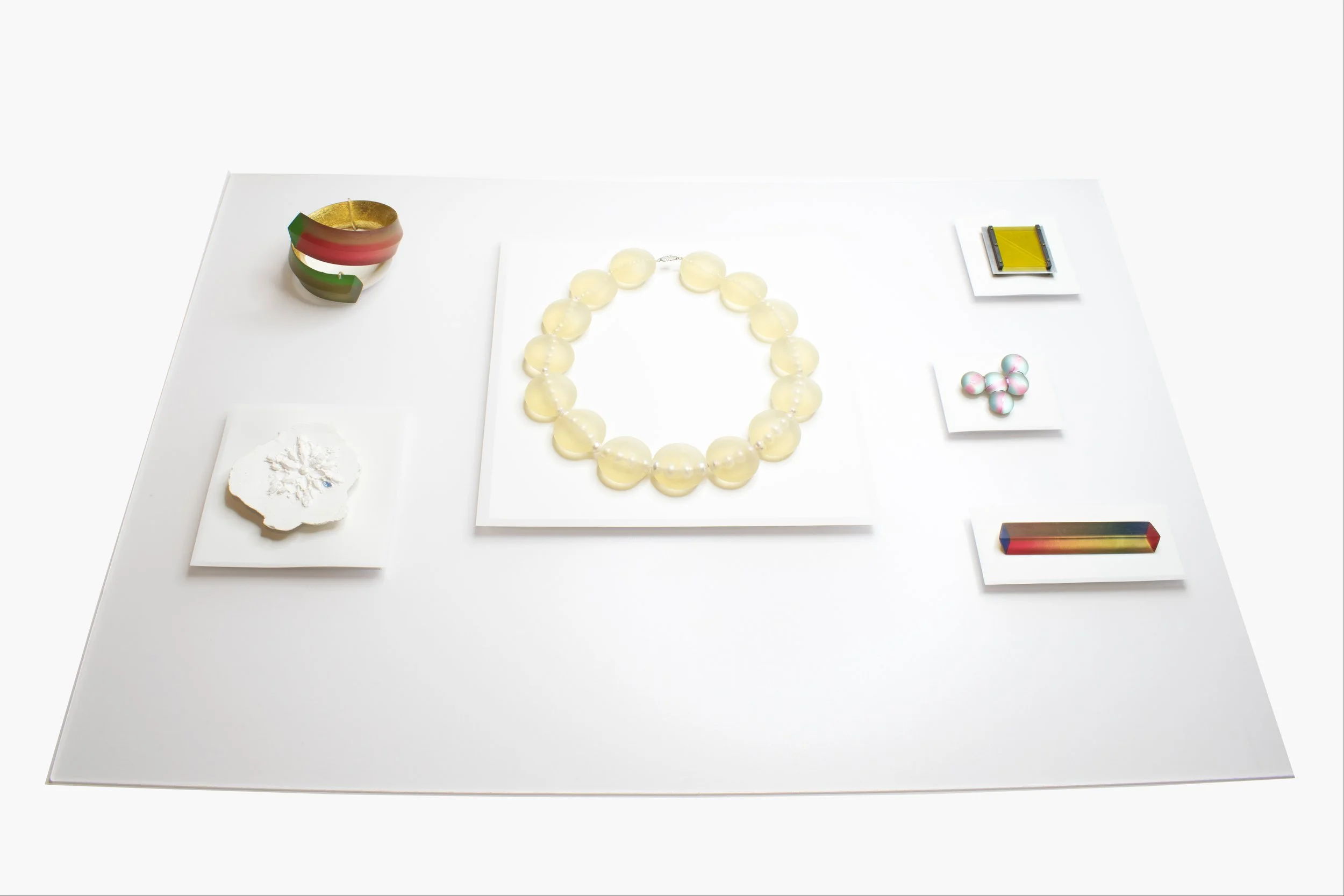 In contemporary jewelry-making value can lie entirely in artistry rather than the precious materials used. This approach leaves artists free to use modern, inexpensive substances like plastic, silicone, glass, and other “alternative” materials to create works that use color and light to dazzle us rather than gold and diamonds.